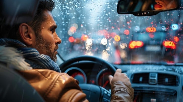 Elliot drives his taxi through the rain; there's a passenger in the back who seems nervous.